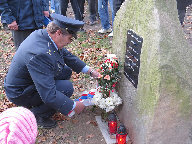 mjr. František Doležal 12. listopadu 2014 uplynulo 40 let od tragické havárie mjr. Františka Doležala. Neovladatelný letoun MiG-21 ještě dovedl mimo sídliště v Ostravě Staré Bělé, ale na osobní záchranu bylo již pozdě. Jeho čin patří mezi 17 nejvíce hodnocených hrdinských činů. Pietního aktu se účastnila i vdova po Františku Doležalovi. Naše odbočka předala děkovný diplom p. Dlouhému za dlouholetou péči o památník. P. Kaplanem nám byly předány drobné pozůstatky letounu, které po letech našel.