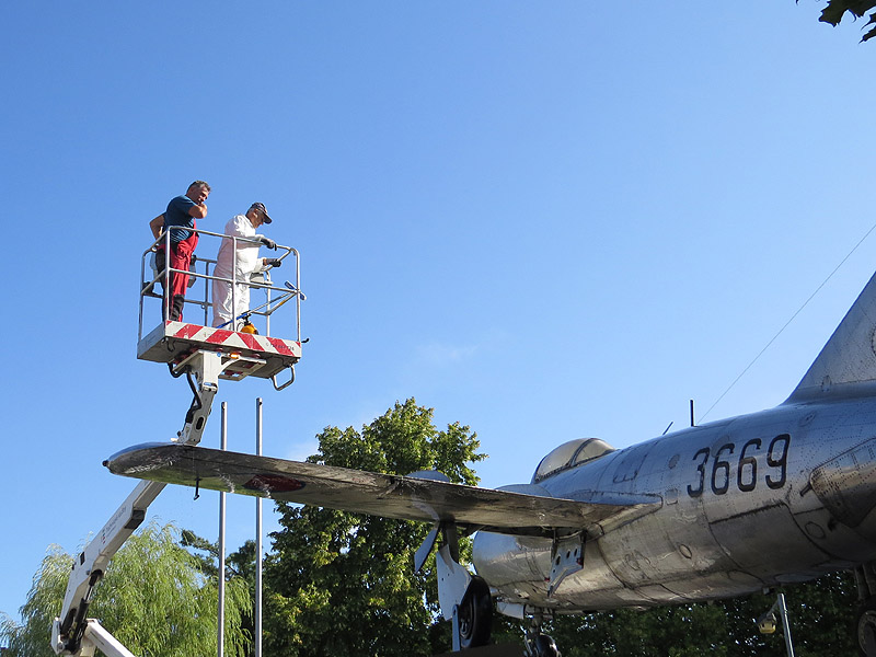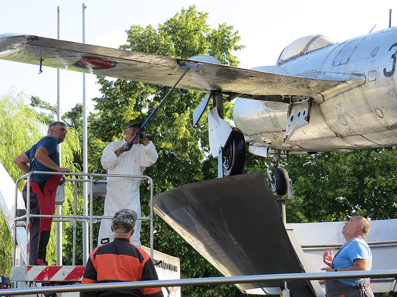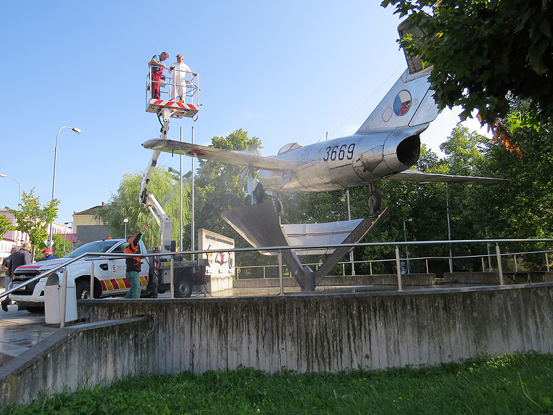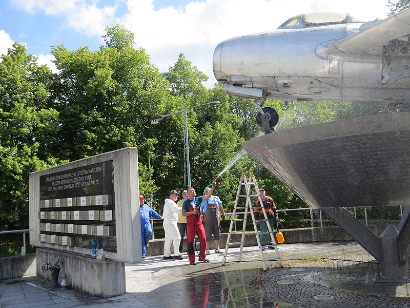 Obnova leteckých památníků Po dlouhém čase příprav se v srpnu konečně uskutečnila akce - obnova leteckých památníků v Příboru. Po domluvě s místostarostou města Ing. Majerem, který zajistil pomoc Technických služeb města, jsme umyli oba památníky. Problém s mycím prostředkem nám pomohlo vyřešit vedení leteckých opraven JOBAir Mošnov, kterým tímto děkujeme. Na umývání se podíleli členové SL a Technických služeb. Obnovu trupových čísel, výsostných znaků a podvozku a kabiny zajistí v následném čase podle počasí členové SL Příbor.