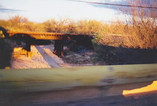 Tak tohle je ten dřevěný železniční most... Je focen za jízdy z auta,