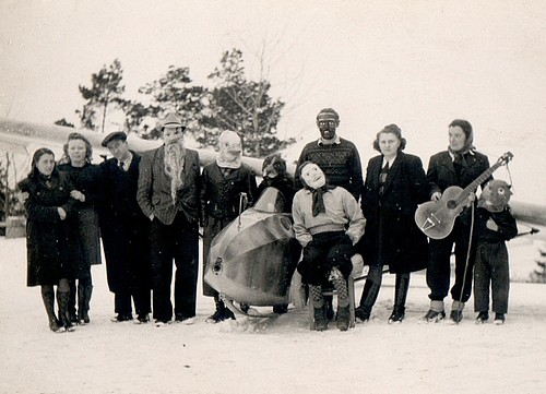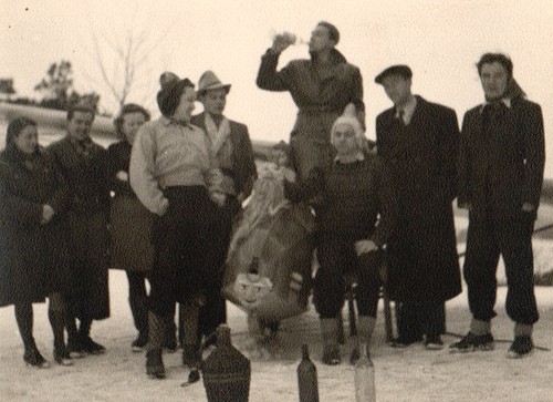 Silvestr u větroně. Zleva účetní Jana, její manžel, kuchařka Polda, já a nahoře velitel školy Jarda Milek.